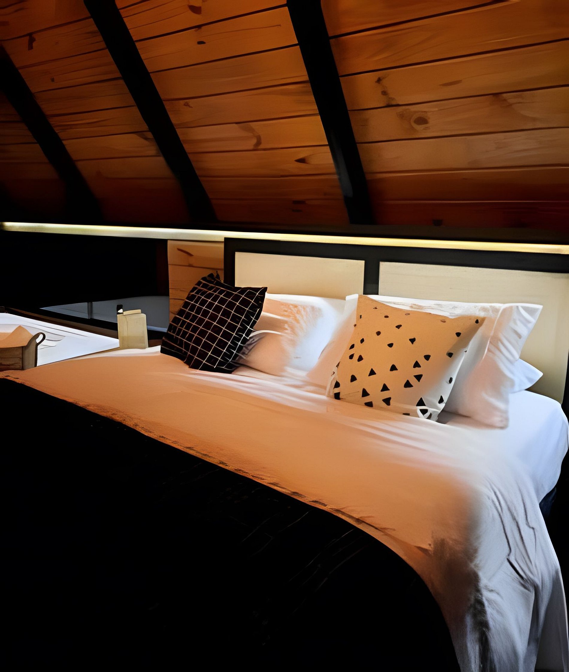 O interior foi cuidadosamente projetado para garantir conforto e romantismo. Um espaço confortável oferece uma cama com rouparia de alto padrão, perfeita para noites tranquilas e relaxantes.
