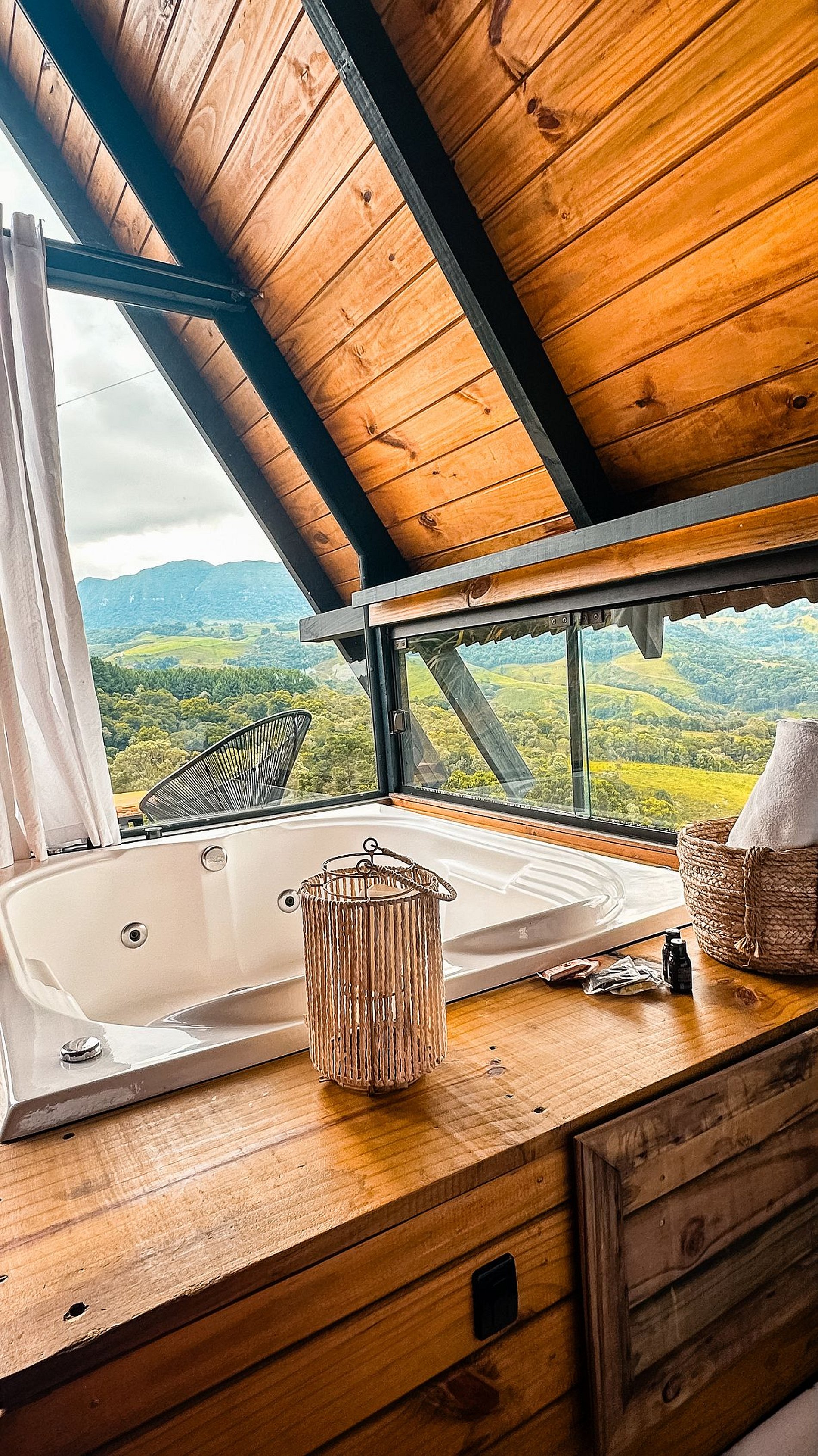 Além disso, uma banheira de hidromassagem privativa com amenities(Sais e espumas) de qualidade, proporciona momentos de puro relaxamento, onde vocês podem desfrutar de um banho relaxante enquanto apreciam a vista das montanhas.